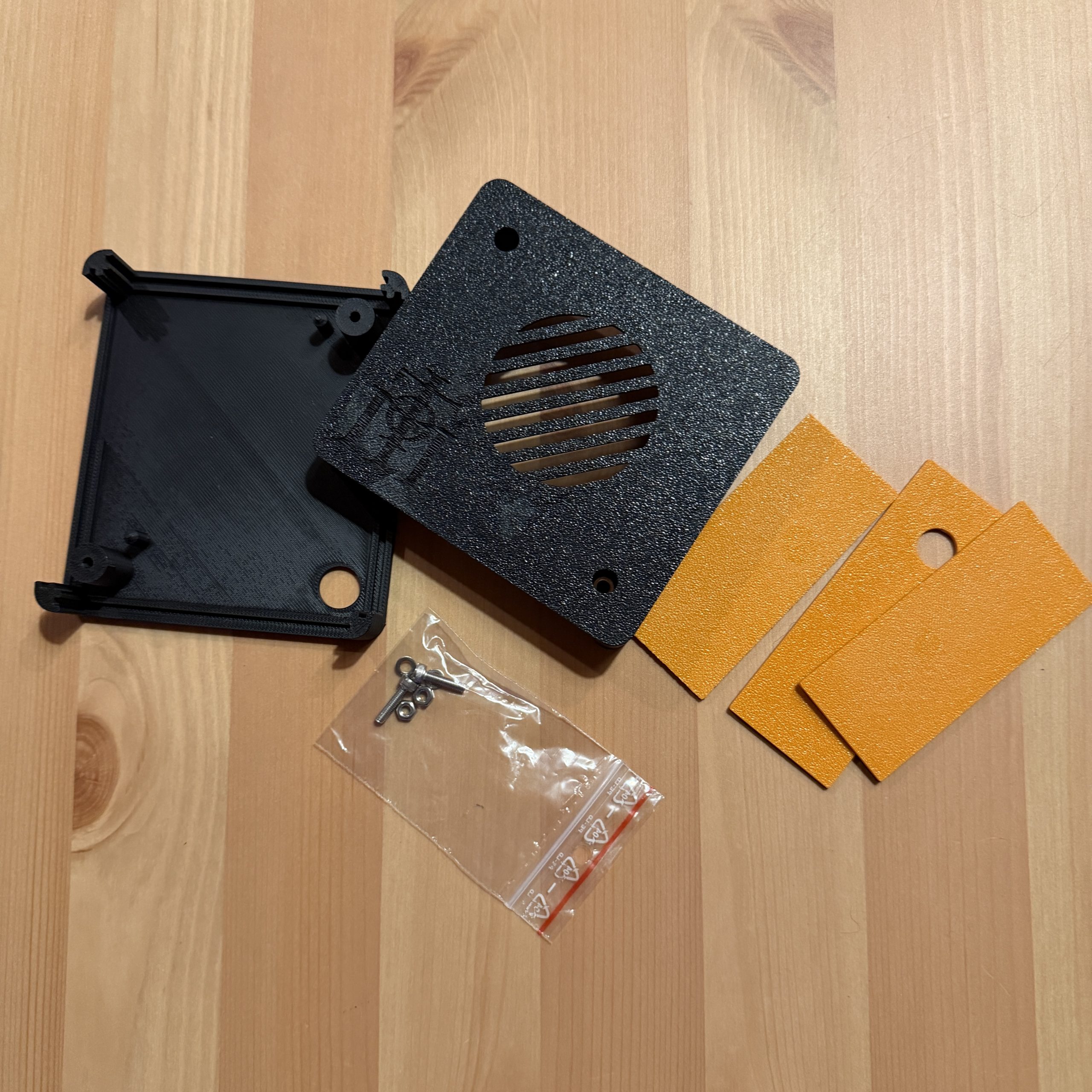 • vrchní a spodní černý díl pro montáž ventilátoru 7530 (nejprve vyzkoušejte jestli sedí rozteče, případně poupravte/zbrušte trny na které se ventilátor nasadí – bývají drobné rozdíly v rozteči od různých výrobců) – máte možnost si vybrat zda-li chcete variantu s otvorem pro pojistkové pouzdro s otvorem 12mm