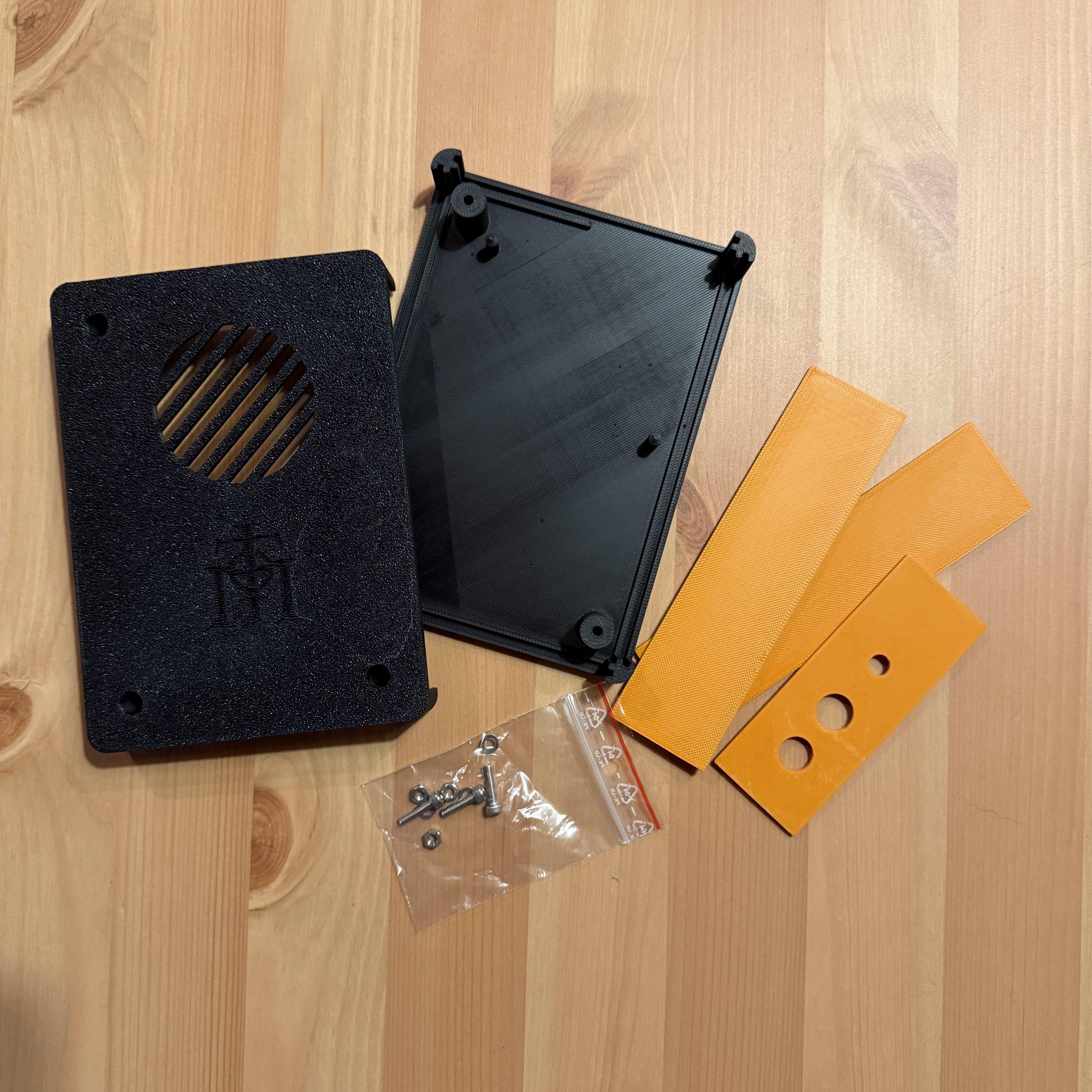 • vrchní a spodní černý díl pro montáž ventilátoru 7530 (nejprve vyzkoušejte jestli sedí rozteče, případně poupravte/zbrušte trny na které se ventilátor nasadí – bývají drobné rozdíly v rozteči od různých výrobců)